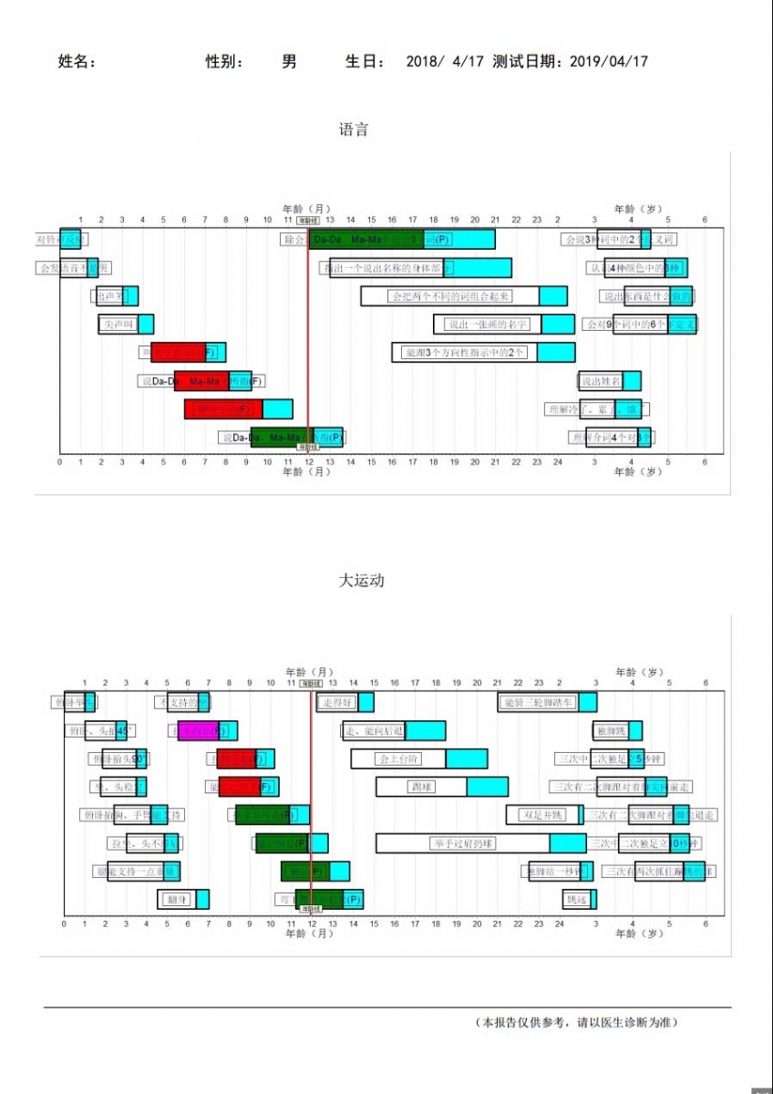 2、按照完成每個項目人數(shù)的25%、50%、75% 和90%作為標(biāo)準(zhǔn),將被查兒童與常模相比較,初步了解兒童的發(fā)育狀況。例如在某個年齡階段,90%的兒童都能掌握某項技能,而某被查兒童卻不能掌握,這一測驗結(jié)果表明該兒童在這方面的發(fā)展可能遲滯。通過一系列項目的測驗,丹佛發(fā)育篩查測驗?zāi)芴峁┰S多關(guān)于兒童心理發(fā)展?fàn)顩r的有價值的信息。