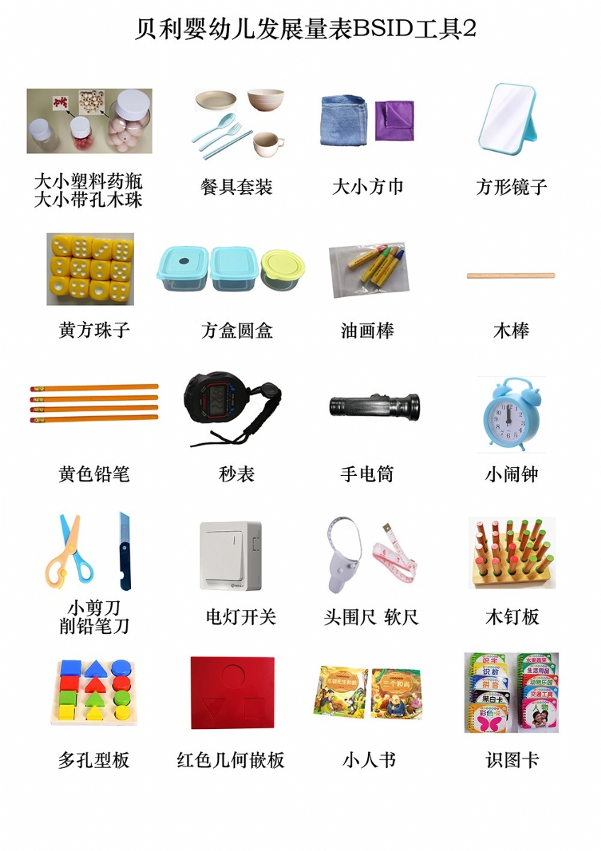 手握鈴鐺、小鈴鐺、花鈴棒、撥浪鼓、小沙錘、捏捏響玩具、玩具小椅子、拖拉玩具(帶線)、小正方體積木(紅12個,黃藍(lán)綠各2塊)、可拆卸娃娃、布娃娃、圓環(huán)、紅球、大球、紅毛絨球、籃球、紅色小球、細(xì)繩、不銹鋼口杯、塑料杯、大號塑料藥瓶、小號塑料藥瓶、餐具套裝、大小方巾、方形鏡子、大木珠(帶孔)、小木珠(帶孔、)黃方珠子、塑料方盒、塑料圓盒、油畫棒、指揮棒、黃色鉛筆、秒表、手電筒、小鬧鐘、電燈開關(guān)、頭圍尺、軟尺、木釘板、多孔型板(含圓形、方形、三角形各4塊)、幾何嵌板(含圓、三角、方形,厚8mm)、小人書識圖卡(果蔬、人物、動物、交通等)、粉色卡紙、手帕紙、鐘表圖1234、圖畫12(BSID)、BSID采集表、BSID使用手冊、整理箱等。